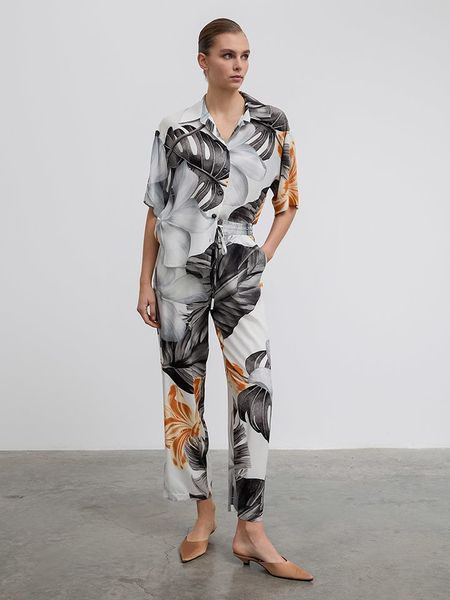 – czysta wiskoza- wysokość pasa: high waist- fason: regular fit- krój nogawek: prosty- pas: ściągacz tunelowy- kieszenie: wpuszczane- wzór: na całościUwaga: Przy wyborze właściwego wariantu zaleca się korzystanie z tabeli rozmiarów.