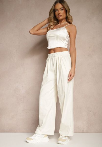 Jasnobeżowe Szerokie Spodnie z Bawełną High Waist Ozdobione Koronką Efandiela