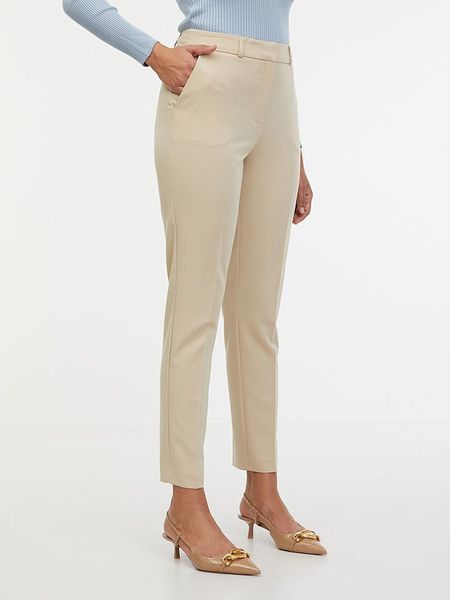 – wysokość pasa: high waist- fason: slim fit- krój nogawek: wąski- szlufki na pasek: tak- zapięcie: haczyk i suwak- kieszenie: wpuszczane- długość nogawki: 7/8- detale: kant- look: jednokolorowy