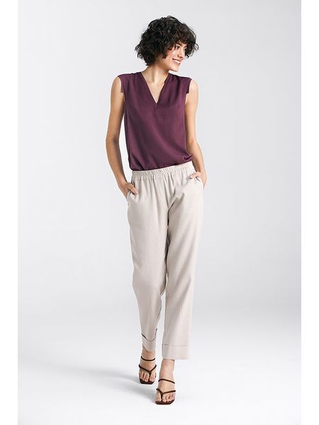 – z dodatkiem lnu- pas / ściągacz: elastyczny- kieszenie: wpuszczane i tylne- krój: prosty- look: jednokolorowyUwaga: Przy wyborze właściwego wariantu zaleca się korzystanie z tabeli rozmiarów.