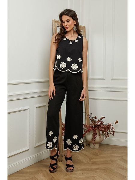 Czarne Szerokie Spodnie z Bawełny z Wysokim Stanem Ozdobione Haftem Mileneia
