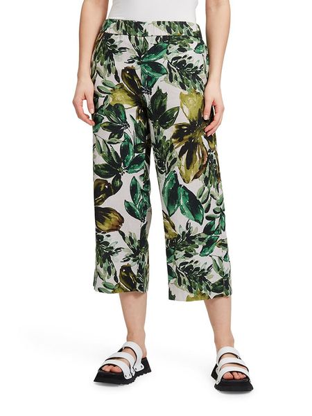 – czysty len- pas / ściągacz: elastyczny- zakończenia nogawek: dzwony- długość nogawki: 7/8- krój: prosty- wzór: kwiatowy