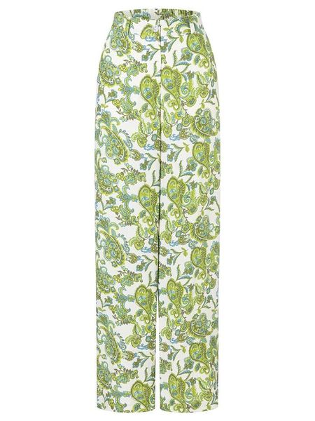 – czysta wiskoza- wysokość pasa: high waist- zapięcie: guzik i suwak- szlufki na pasek: tak- fason: comfort fit- krój nogawek: szeroki- wzór: orientalny