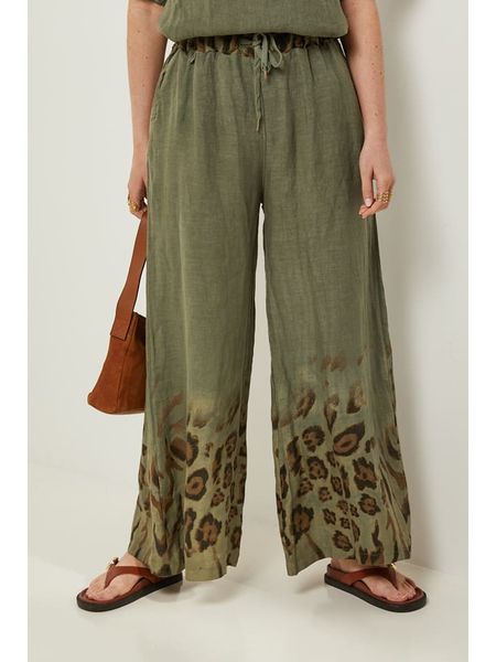 – czysty len- wysokość pasa: high waist- pas: ściągacz tunelowy- kieszenie: wpuszczane- krój: luźny- wzór: panterka