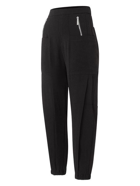 – wysokość pasa: high waist- fason: tapered fit- krój nogawek: wąski- pas / ściągacz: elastyczny- kieszenie: tylne- zakończenia nogawek: elastyczne- detale: dekoracyjne zamki błyskawiczne- look: jednokolorowy
