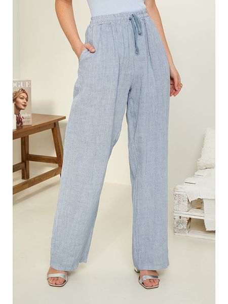 – czysty len- pas: ściągacz tunelowy- kieszenie: wpuszczane- krój: luźny- wzór: paski