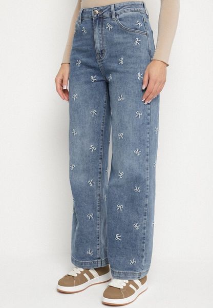 Niebieskie Szerokie Jeansy z Wysokim Stanem Zdobione Haftem w Kokardki Saliadia