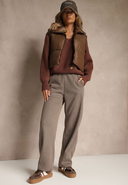 Brązowe Szerokie Spodnie Ocieplane z Bawełny High Waist Iltilia