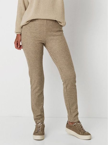– wysokość pasa: high waist- fason: slim fit- krój nogawek: wąski- szlufki na pasek: tak- pas / ściągacz: elastyczny- kieszenie: wpuszczane i tylne- wzór: pepitka