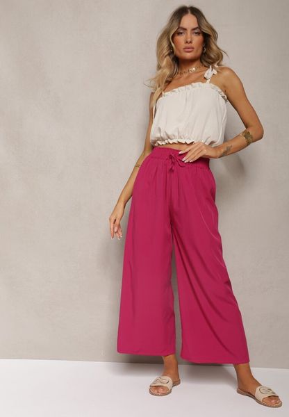 Ciemnofioletowe Spodnie High Waist z Szerokimi Nogawkami z Wiskozą Wykończone Gumką w Talii Crisantas