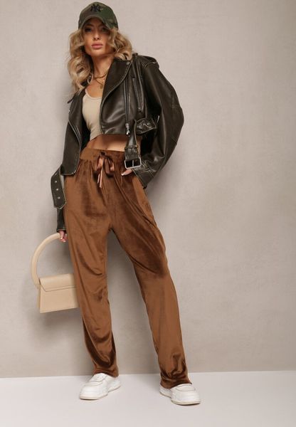Brązowe Welurowe Spodnie Dresowe z Luźnymi Nogawkami Heliotte