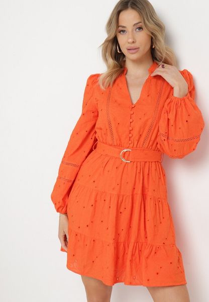 Pomarańczowa Haftowana Sukienka z Bawełny Zapinana przy Dekolcie na Guziki z Gumką w Pasie i Paskiem Passema