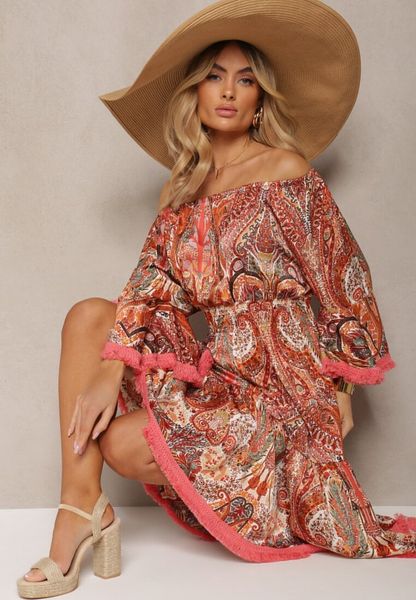 Czerwona Rozkloszowana Sukienka w Print Paisley z Frędzelkami i Hiszpańskim Dekoltem Jotalle