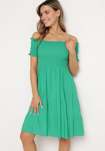 Zielona Bawełniana Sukienka z Hiszpańskim Dekoltem z Szerokimi Falbanami na Dole Bliria