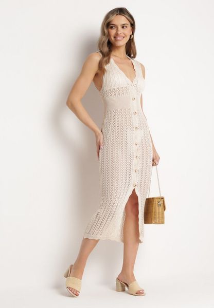 Beżowa Plażowa Sukienka Bodycon z Ażurowej Tkaniny Zapinana na Guziki Kyren