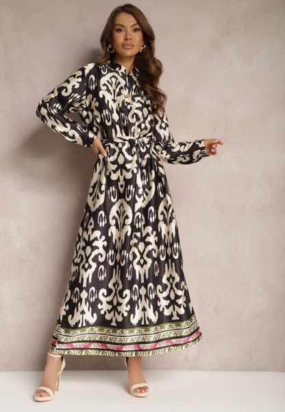 Czarno-Biała Pudełkowa Sukienka Satynowa z Paskiem w Talii w Ornamentalny Print Tarosa