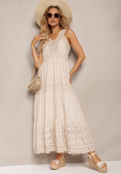 Beżowa Rozkloszowana Sukienka z Koronki z Trójkątnym Dekoltem i Falbanką Piolena