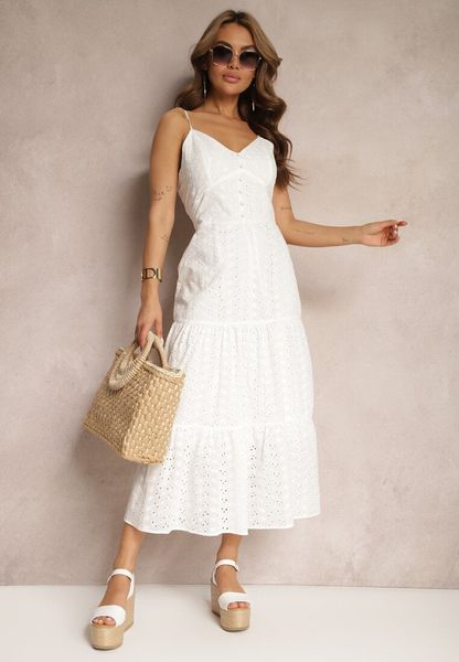 Biała Bawełniana Sukienka z Cienkimi Ramiączkami o Haftowanym Wykończeniu z Gumką w Talii Lomila