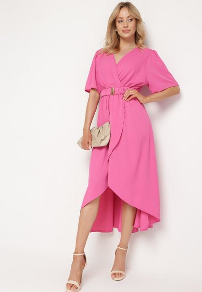 Różowa Rozkloszowana Sukienka Kopertowa z Gumką w Talii i Ozdobnym Paskiem Vasena