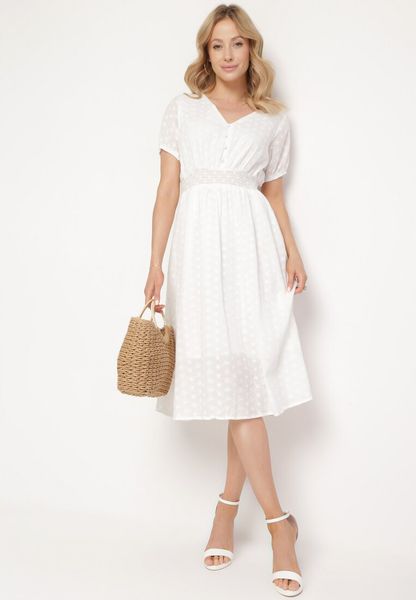 Biała Bawełniana Sukienka z Ozdobnym Haftem i Cienkimi Gumkami w Pasie Gemilla