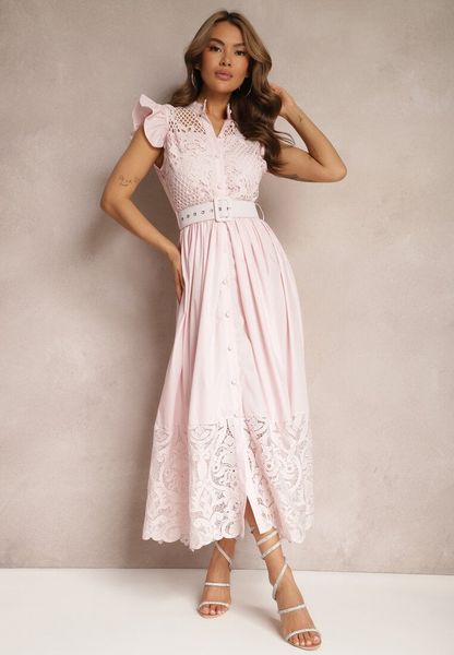 Różowa Koszulowa Sukienka z Ażurowym Zdobieniem i Paskiem z Prostokątną Klamrą Trika