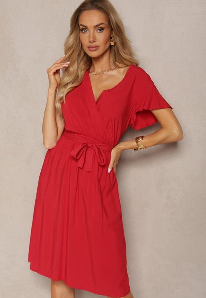 Czerwona Rozkloszowana Sukienka Midi z Wiązanym Paskiem Elemia
