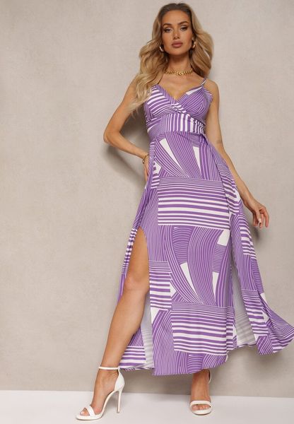 Fioletowa Sukienka z Regulowanymi Ramiączkami z Gumkami z Tyłu i Rozcięciami Fatoria