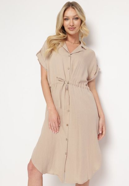 Beżowa Koszulowa Sukienka Midi z Wiskozy na Guziki z Troczkiem i Wycięciami Alicana
