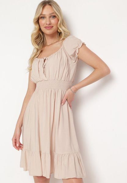 Beżowa Wiskozowa Sukienka z Gumkami w Pasie Ściągana przy Dekolcie z Falbanką Tiimamla