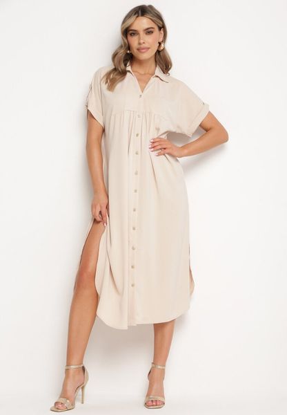 Beżowa Sukienka Koszulowa Zapinana na Guziki z Podwijanymi Rękawami Moarisa