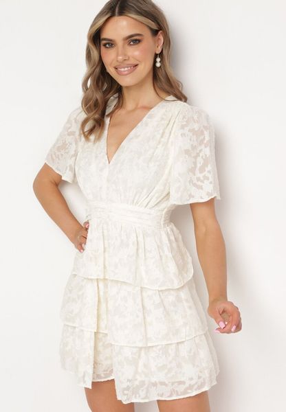 Jasnobeżowa Rozkloszowana Sukienka z Trójkątnym Dekoltem z Gumką w Pasie i Falbankami Crapia