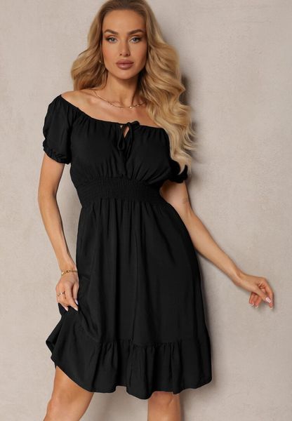 Czarna Sukienka z Wiskozy z Gumkami w Talii i Dekoltem ze Ściągaczem Tiimazela