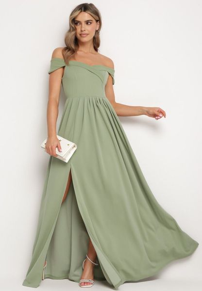 Jasnozielona Koktajlowa Rozkloszowana Sukienka z Hiszpańskim Dekoltem i Rozcięciem na Nogę Gralia