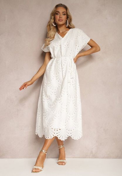 Biała Bawełniana Sukienka o Haftowanym Wykończeniu z Materiałowym Paskiem w Talii Dimla