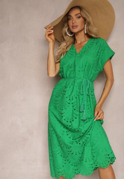 Zielona Bawełniana Sukienka o Haftowanym Wykończeniu z Materiałowym Paskiem w Talii Dimla