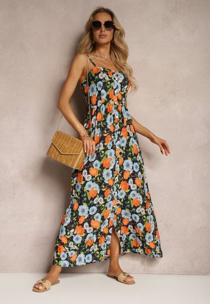 Granatowo-Niebieska Wiskozowa Sukienka w Kwiaty z Gumką w Pasie i Regulowanymi Ramiączkami Ostialia