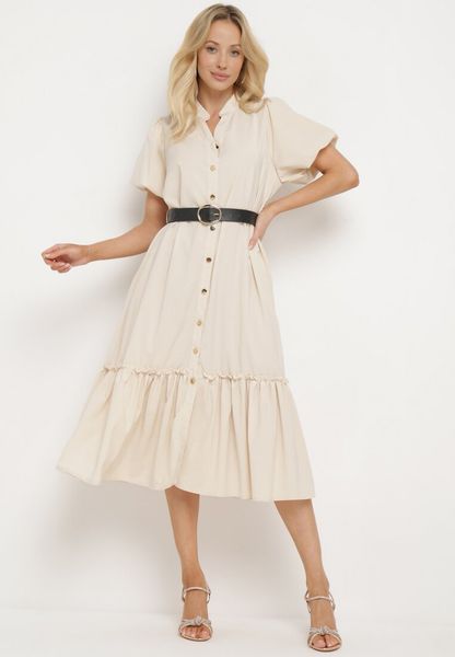 Beżowa Koszulowa Sukienka z Krótkim Rękawem Zapinana na Guziki z Paskiem z Ekoskóry Xantantia