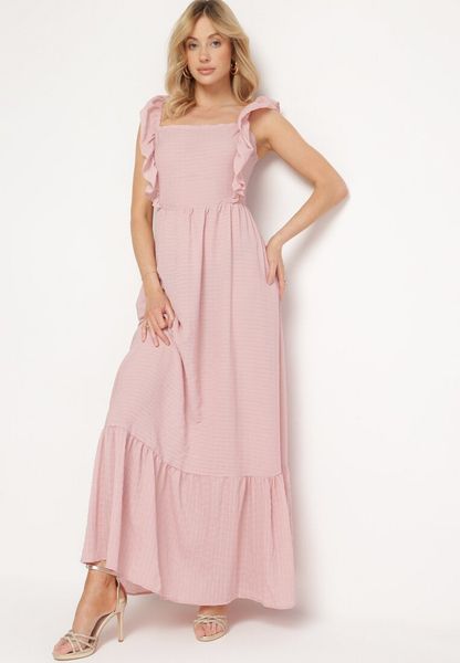 Różowa Sukienka na Ramiączkach z Falbankami i Gumką w Talii z Wiązaniem na Plecach Tiolla