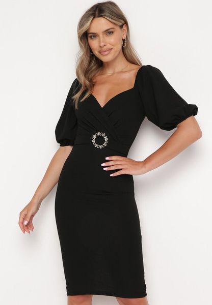 Czarna Sukienka Dopasowana z Paskiem i Klamrą w Talii oraz Bufiastymi Rękawami Lurdia