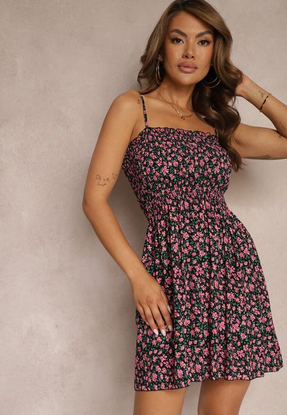 Czarno-Różowa Sukienka z Bawełny na Cienkich Ramiączkach z Gumką w Talii Tessinia