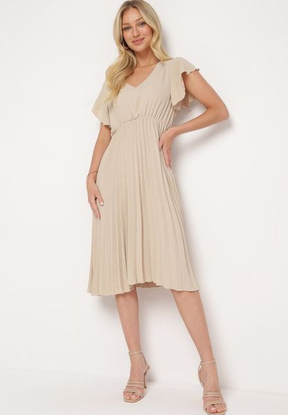 Beżowa Sukienka Plisowana o Rozkloszowanym Fasonie i Trójkątnym Dekolcie Rissara