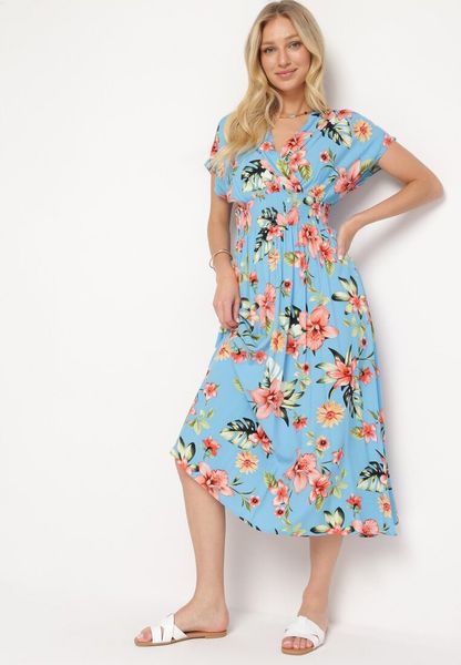 Niebieska Kwiecista Sukienka z Kopertowym Dekoltem i Gumką w Pasie Meobia