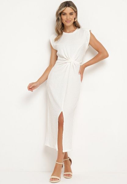 Jasnobeżowa Sukienka z Marszczonej Tkaniny Ozdobiona Imitacją Węzła z Rozcięciem Risley