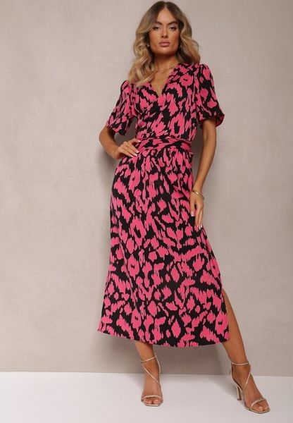 Czarno-Różowa Sukienka z Kopertowym Dekoltem i Ozdobnymi Wycięciami z Gumką w Pasie i Paskiem Bonlea