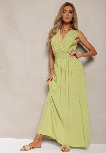 Zielona Taliowana Sukienka z Wiskozy Wykończona Gumkami w Talii i Kopertowym Dekoltem Kairidia