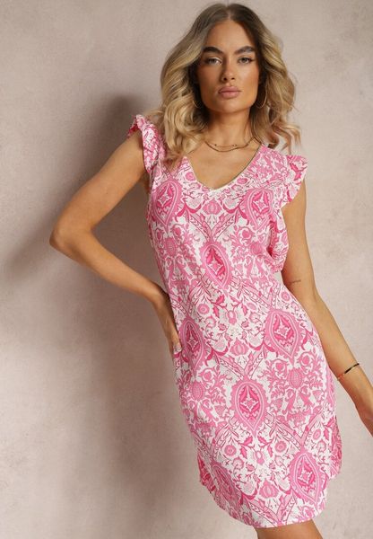 Różowa Pudełkowa Sukienka Mini w Kwiaty z Falbankami i Dodatkowym Paskiem Jozelin
