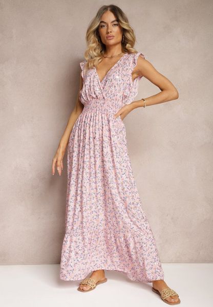 Różowa Sukienka z Wiskozy o Rozkloszowanym Kroju z Gumką w Pasie i Falbankami Xardia