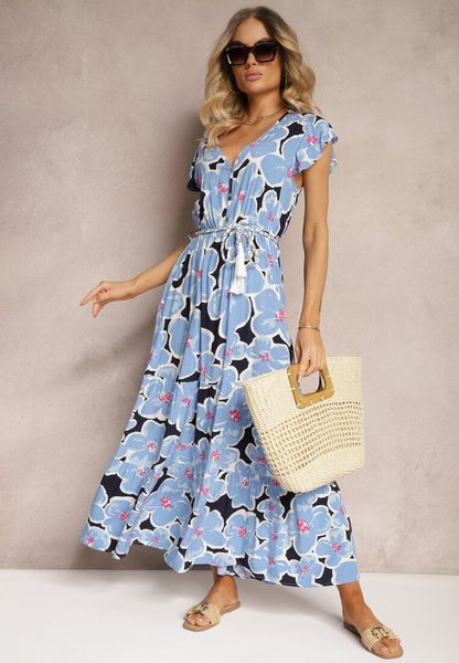 Niebieska Kwiecista Sukienka z Wiskozy z Gumką w Talii Wiązana Materiałowym Paskiem Vikennia