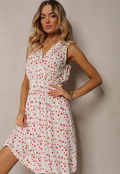 Biało-Różowa Kopertowa Sukienka z Wiskozy w Kwiaty Wykończona Gumką w Talii Innavia