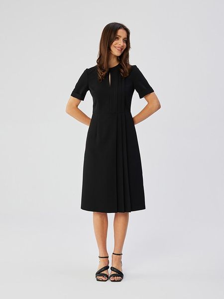 – dekolt: okrągły- zapięcie: suwak na plecach- detale: wycięcia, plisy- krój: prosty- look: jednokolorowy